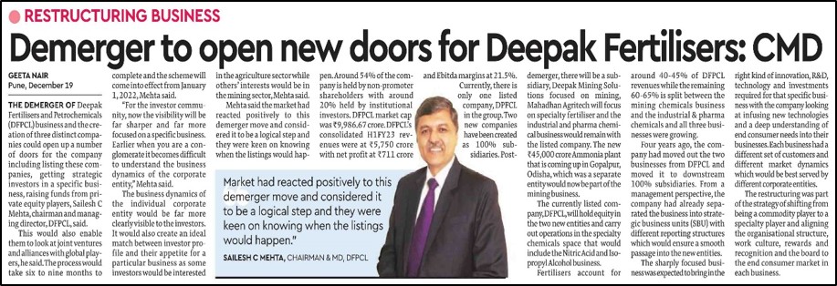 - DFPCL evaluating multiple strategic options following demerger: Financial Express, December 20, 2022