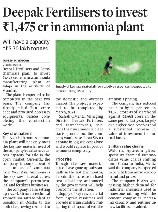 - DFPCL to commission new ammonia plant: Financial Express, May 25, 2023