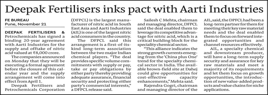 - DFPCL Enters ₹8,000 Cr, 20-Year Nitric Acid Supply Pact with Aarti Industries, Financial Express, November 21, 2022
