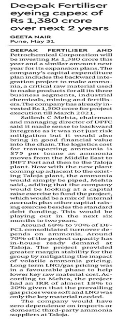 - DFPCL Plans ₹2,760 Cr Capex Allocation for Ammonia Project and Expansion InitiativesFinancial Express, May 31, 2021