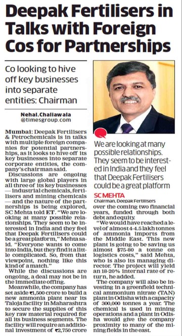 - Deepak Fertilisers PAT up 23%, Financial Chronicle, 26 January, 2012